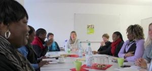 Im Rahmen des zweiwöchigen Austauschs „Inklusion und Illusion zwischen Nord und Süd“ des Netzwerks KONE in Frankfurt fand am 28.01.2015 ein Treffen im VbFF statt. Es war ein sehr lebhafter Austausch zwischen den Frauen aus Douala, Kamerun, zwei Teilnehmerinnen des VbFF, die an den Kursen zur Alten- und Krankenpflege teilnehmen und uns. Themen des Treffens waren u.a. Teilhabe und Benachteiligung im Bildungssystem und die Vereinbarkeit von Familie und Beruf. Abschließend berichtete Francoise Jemea eindrücklich über ihre Erfahrungen als Kleinhändlerin in Douala.