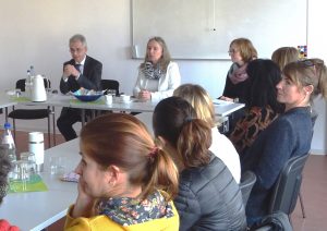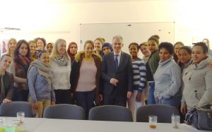 Am 17.01.2018 besuchte Peter Feldmann den VbFF. Teilnehmerinnen des Kurses „Ankommen – Weiterkommen“ und der Vorkurse zur „Teilzeitausbildung für Mütter“ diskutierten mit dem Oberbürgermeister der Stadt Frankfurt über kostenlose Kitaplätze, Wohnungsnot und Probleme bei der Suche nach einem Ausbildungsplatz. Zunächst hieß OB Feldmann die Frauen in Frankfurt willkommen und erklärte, was zu den Aufgaben eines OBs gehört. Der SPD-Politiker appellierte an die Frauen, schnell Deutsch zu lernen und regte sie an, die Stadt mitzugestalten. Im Anschluss stellten die Teilnehmerinnen der Kurse ihre eigenen Fragen, auf die Feldmann mit Verständnis einging. Auch versuchte er, gemeinsam mit den Frauen Lösungen zu finden. „Ich weiß, das Leben ist nicht immer gerade. Aber das ist auch normal“, so Feldmann. Die Frauen waren von dem Besuch des Oberbürgermeisters begeistert: „Er war viel netter, als ich erwartet habe, hat zugehört und ist auf jedes Problem eingegangen“, resümiert eine Teilnehmerin.