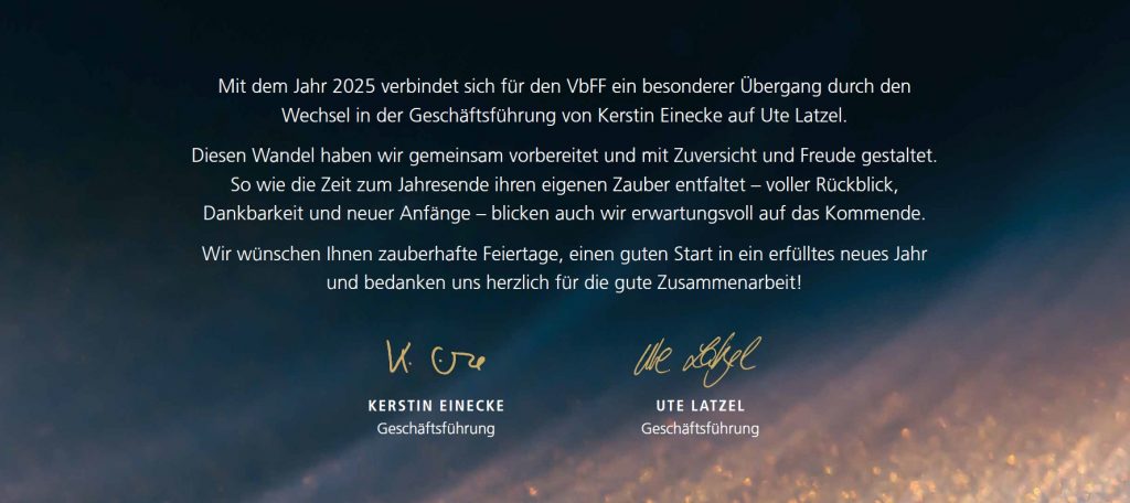 Herzliche Wintergrüße aus dem VbFF e.V. Isabelle Pietsch Aktuelles 18. Dezember 202519. Dezember 2025 Liebe Teilnehmende, liebe Kooperations-Partner*innen, liebe Mitarbeitende, vielen Dank für dieses gemeinsame Jahr! Wir wünschen einen erholsamen Jahresausklang und freuen uns schon auf die Zusammenarbeit 2026.