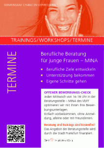 So haben wir gerade unser persönliches Beratungsangebot um ein Beratungsangebot im Internet unter dem Namen „mina-frankfurt“ – Mädchen im Netz und anderswo in Frankfurt erweitert.